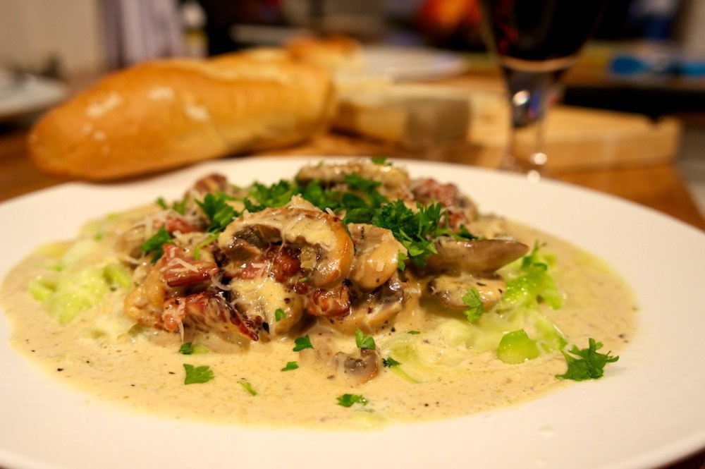 Skjær opp sopp, og brun dette sammen med bacon og hakket hvitløk i en panne. Tøm over fløten, og la det surre et par minutter. Smak til med grovmalt pepper, revet parmesan og basilimum. Trekk det hele av platen. Om du synes sausen er for tynn, kan et egg røres inn. Men om du gjør dette bør ikke retten varmes opp igjen, da blir sausen kornete. Konsistensen på sausen kan også justeres noe ved å tilsette mer parmesan.