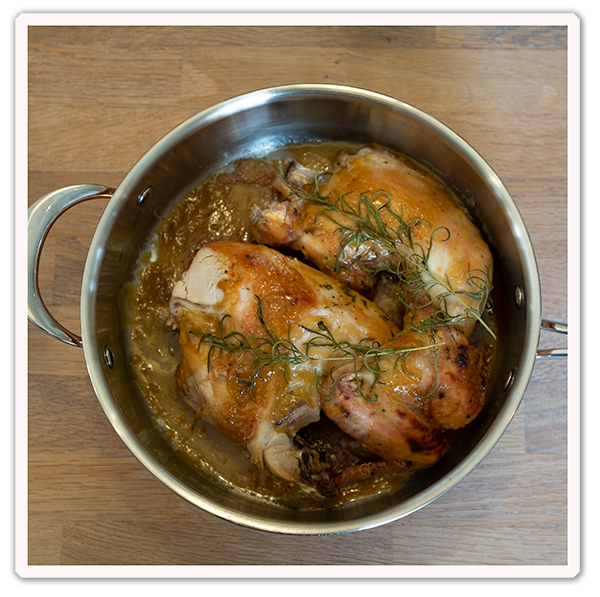 Ha kyllingen i en gryte som tåler stekeovn, og hell honningblandingen over. Legg på et par kvister med rosmarin, og sett det hele i forvarmet ovn på ca 160 grader i en halvtime eller noe. Jeg brukte denne gangen altså ferdig grillet kylling, (nesten) rett fra kjøleskapet og som nok egentlig var i kaldeste laget for å settes i ovnen, så kyllingen skulle bare varmes. Bruker du rå kylling bør gradene økes til 180, og steketiden vil være til kyllingen er gjennomstekt (ca 40 minutter).