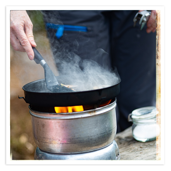 Fyr opp stormkjøkkenet og fram opp pannen. Ha litt smør og legge soppen i bunnen. Stek soppen litt til den har fått litt farge, og hell over en klunk pannekakerøre. Når pannekaken er stekt litt på den ene siden, snur du den og legger på ost og skinke. Stek litt til før du bretter pannekaken på midten slik at ost og skinke forblir inni pannekaken. Etter noen minutter til er maten klar, og man kan sette seg ned med litt drikke og nyte.